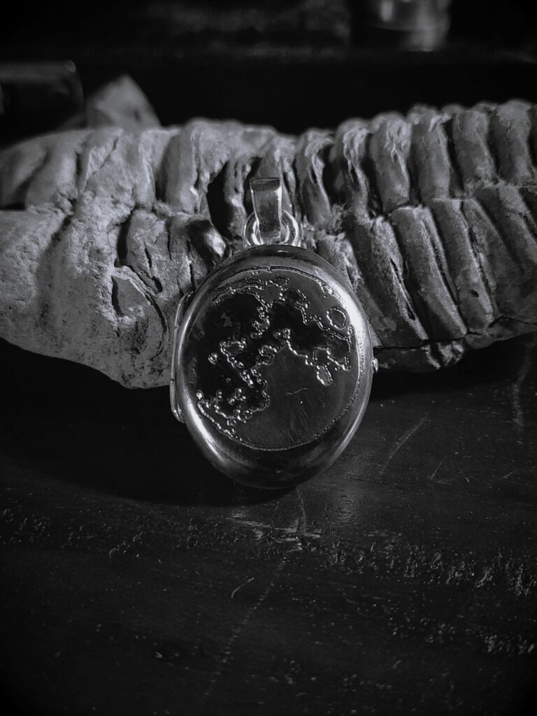 Marraskuu is Finnish and it means November. The moon etched on the cover of the locket is the moon of the November sky. November is the end of the harvest season and the beginning of the winter. November has been thought as a time when the line between the dead and the living is very fragile and connection to the spirit world is strong.